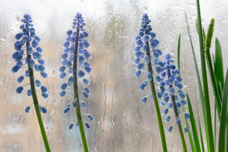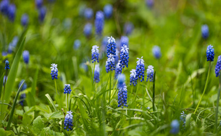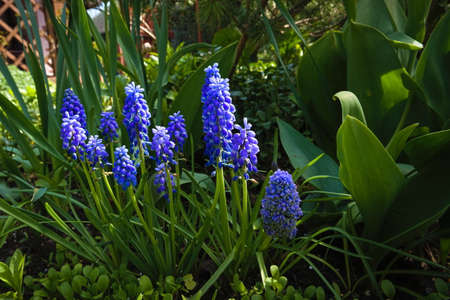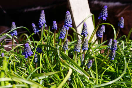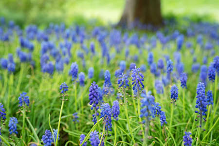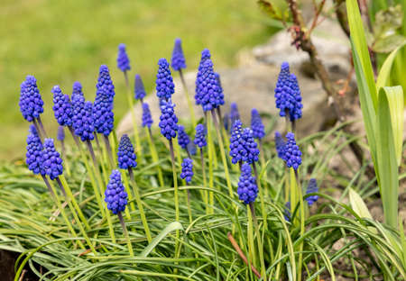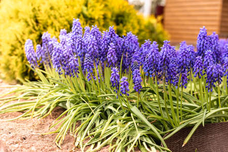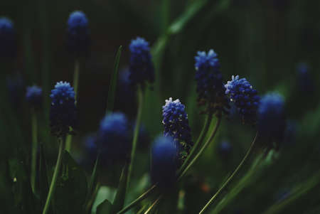 Grape Hyacinth or armeniacum muscari blooming in the spring garden. Beauty in nature.