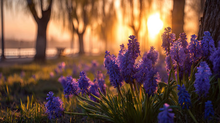 Close-up of vibrant purple flowers in soft focus against a blurred backdrop featuring trees and a brilliant sunset. The composition exhibits natural lighting with warm, golden hues. Ideal for illustrating concepts of spring, growth, and natural beauty. Suitable for diverse commercial and editorial applications.