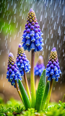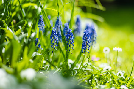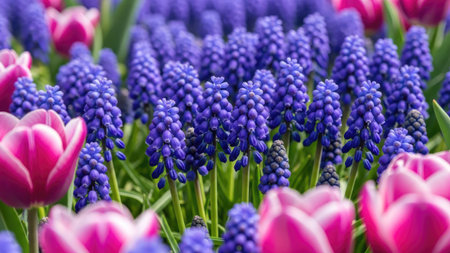 Blooming purple grape hyacinths, muscari fill a garden, basking in the warm spring sunlight and creating a vibrant, cheerful atmosphere that celebrates the beauty of nature