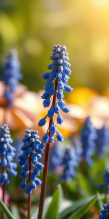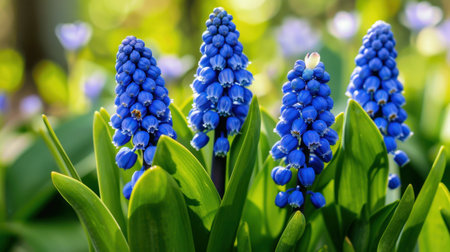 Clusters of vibrant blue grape hyacinths stand tall in a green garden, basking in the warm sunlight of spring. The delicate flowers add beauty to the surrounding landscape.