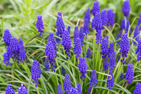 purple muscari Muscari Armeniacum Viola. Many muscari blue flowers in green. Spring muscari hyacinth flowers. Beautiful Blue spring holiday nature background with blue blossoming flowers closeup