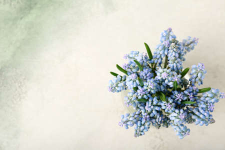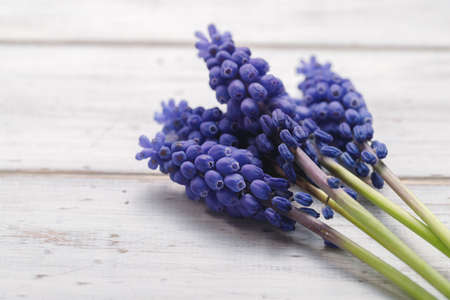 Muscari or murine hyacinth flowers on blue pastel background. side view, close up, still life. Beauty, spring, summer concept. viper bow.