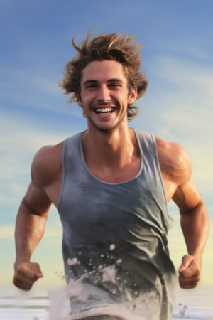 Portrait of happy man running on the beach.
