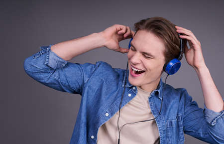 A handsome young energetic guy raises his hands in happiness, wears a headset, sings along with his favorite song, has a joyful expression isolated on a gray background, relaxes indoors.