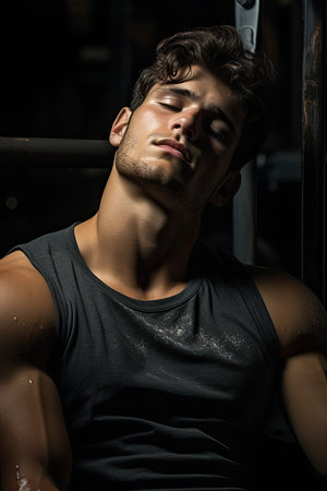 An athletic young man is in a studio space, showcasing strength and focus while wearing a simple white t-shirt.