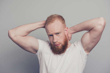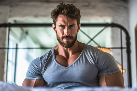 Handsome strongman man with a lot of muscle, looking at camera.