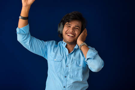 Portrait of a handsome young man enjoying music on headphones on blue background.