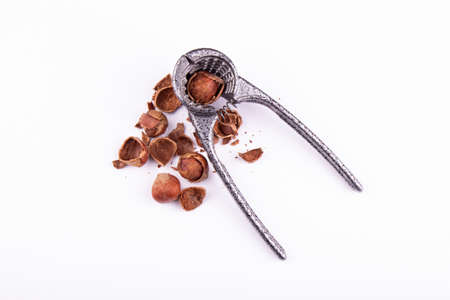 nutcracker with broken hazelnuts on a white background