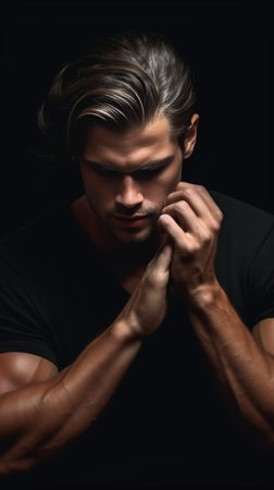 Two young handsome men, one with blond hair and the other with a serious face on a black background. Generative AI.