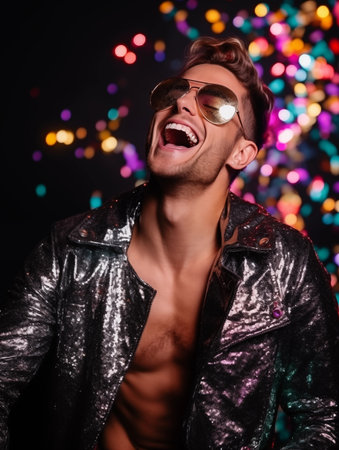 Young pretty man dressed in sequined jacket having fun on New Year party, happy guy dancing and laughing with sparkles and confetti, purple and cold colors