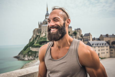 Handsome young man with long hair and beard on the background of the Mont Saint Michel in Normandy, France