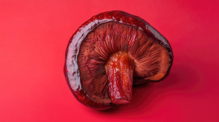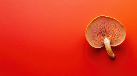 A stunning close-up of a single mushroom showcasing its rich texture and color against a bold red background, perfect for nature and food themes.