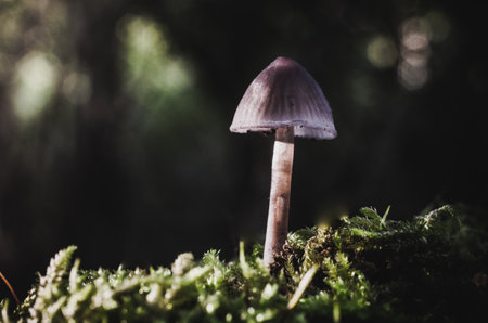 Mushroom in the forest with green moss and bokeh