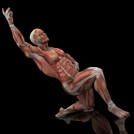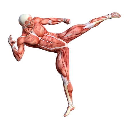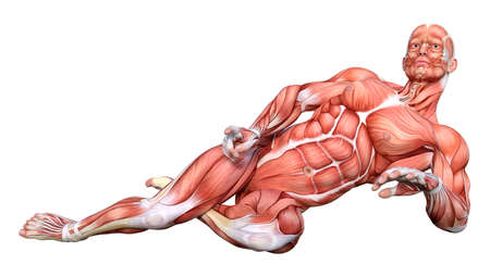 3D rendering of a male anatomy figure with muscles map exercising isolated on white background