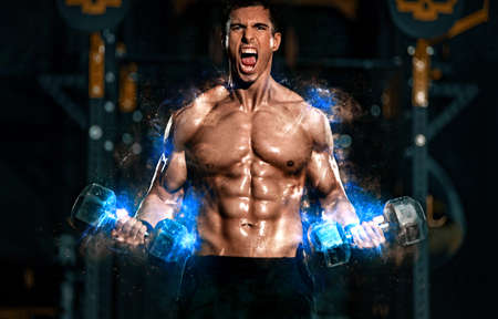 strong young male with beard and powerful abdominal muscles indoors night sport gym