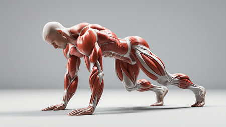 Human muscular system depicting detailed anatomy with visible muscles, tendons, and veins, representing biological science and medical education concepts