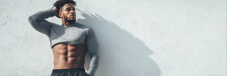 Young athlete in a fitted sports top adjusts his attire while leaning against a white wall, highlighting dedication to fitness and athleticism.