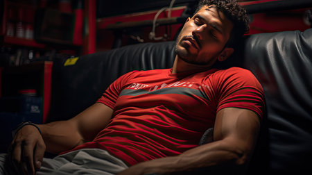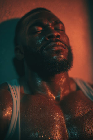 A close-up of an athlete resting against a wall, sweat glistening on his skin. The cinematic lighting and motivational tone highlight his exhaustion and determination.