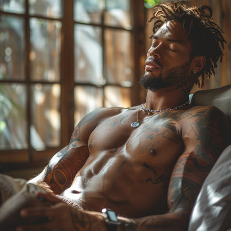 A serene portrait of a relaxed, handsome man with tattoos basking in the warm sunlight by the window.