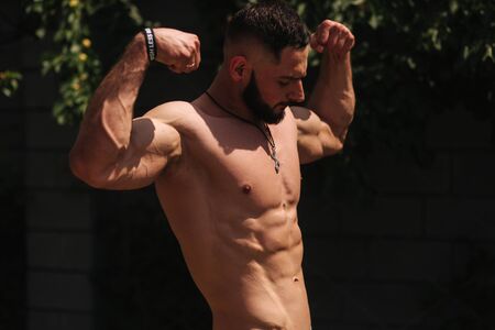 Young bearded man bodybuilder show his muscles outside after training