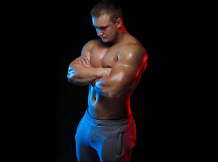 male bodybuilder athlete with naked torso posing against a black background, in red and blue light