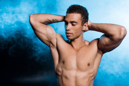 sexy mixed race man with tattoo standing on blue with smoke
