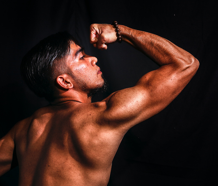 Power symbol background. Fighter strength body part. Young man muscle background. Fit diet and exercises. Muscular body biceps. Light and shadow artistic workout inspiration. Soldier at war symbol.