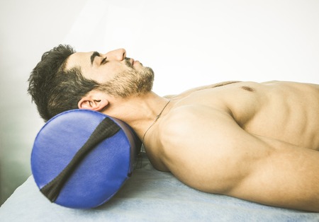 Young man lying on a massage table. Concept of spa, relaxation and physiotherapy