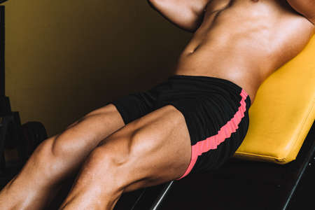 Strong legs of a man in shorts exercising in the gym