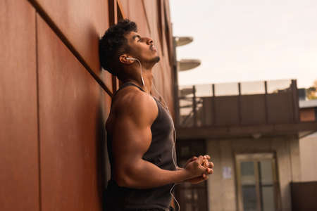 Fit strong shirtless young African black man standing at urban wall.