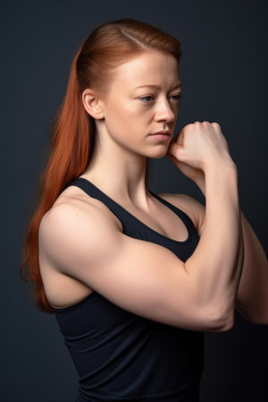 studio shot of a sporty young woman flexing her bicep against a gray background