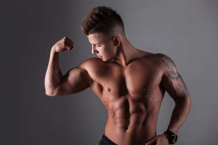 Young healthy powerful athlete with strong biceps standing on gray background