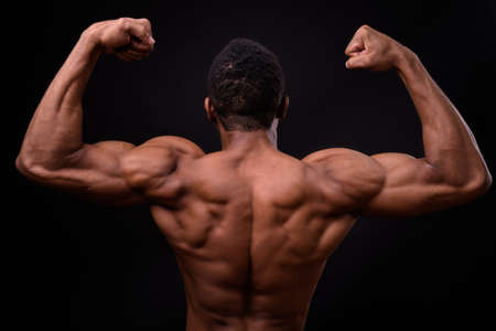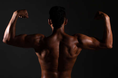 Bodybuilder showing his back and biceps muscles, personal fitnes.Brown-skinned