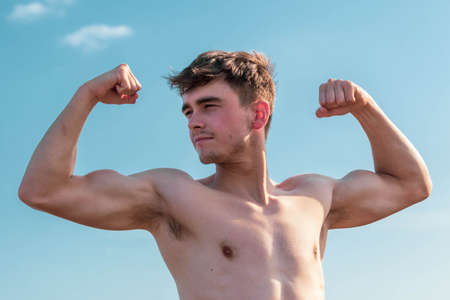 Muscular man showing muscles on sky background. Strong male naked torso abs