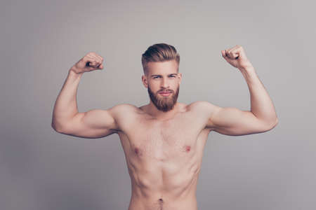 Portrait of brutal sporty athletic sportive fit slender muscular handsome serious flirty strong powerful coquettish macho demonstrating big biceps isolated on gray background