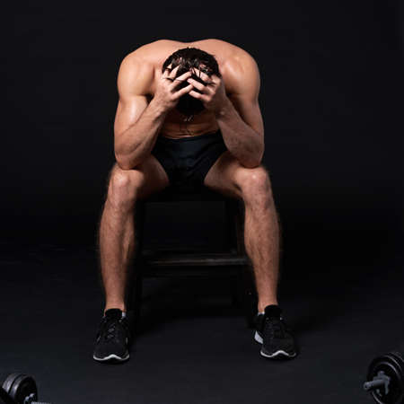 Young handsome muscular caucasian man with lowered head
