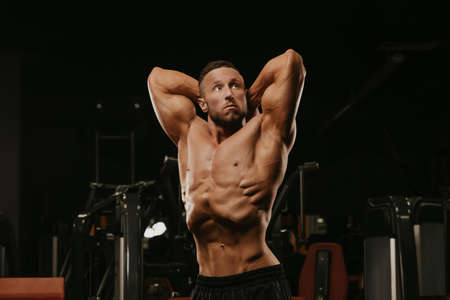 Sporty handsome guy bodybuilder model with a healthy naked muscular torso shows his biceps on a dark background. Healthy lifestyle and diet