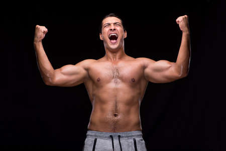 Aggressive man is a fighter, a bodybuilder with a naked torso on a black