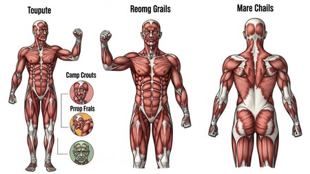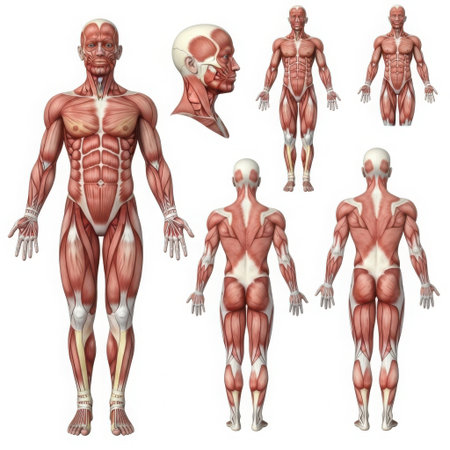 Human muscular system anatomy illustration featuring front, back, and side views.