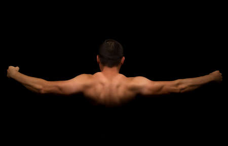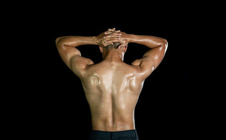 Close up of sports mans muscular back isolated on black background