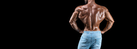 No name sexy muscular man in jeans posing on black background. Back view. Bodybuilding and fitness concept. Mixed media