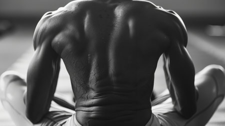 A man with a muscular back is sitting on the floor. The man's back is covered in sweat, and he is relaxed