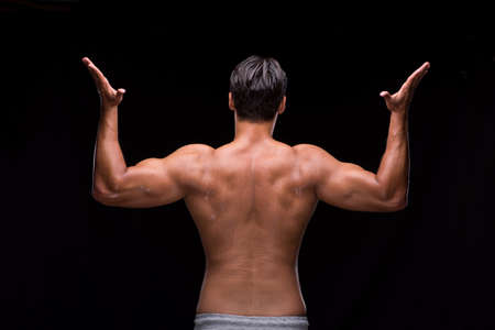 Strong muscular bodybuilder showing his back muscles posing on dark background