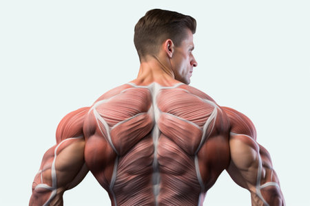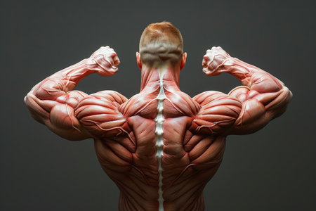 Stunning portrayal of back muscular anatomy, showing muscle fibers and spine, with soft lighting to highlight details.