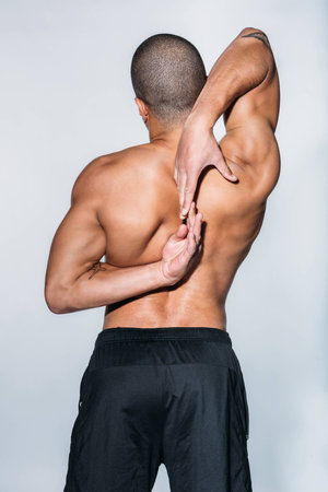 Athletic african male bodybuilder showing arms and shoulders muscles, rear view