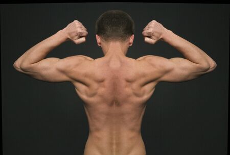 Muscled male model showing his back on grey background