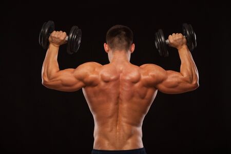 Muscular male model bodybuilder doing exercises with dumbbells, turned back. Isolated on black background with copyspace