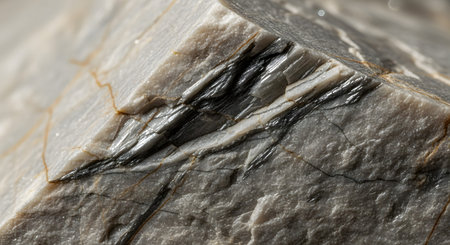 A macro close-up of a grey rock fragment featuring sharp edges and metallic or crystalline layers. The detailed texture highlights the mineral composition and geological structure of the stone.