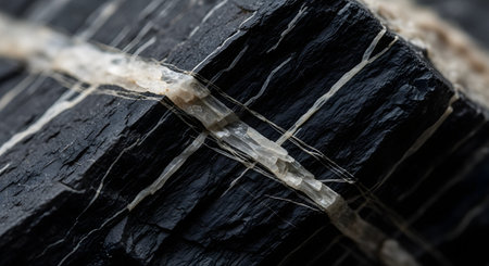 A close-up macro shot of a black rock surface featuring a distinct, jagged white mineral vein running through it. The texture is rough and layered, highlighting the geological formation and contrast between materials.
