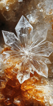 A striking crystal structure mimicking a snowflake emerges from a rough, natural rock surface, highlighting the beauty of mineral formations in nature.